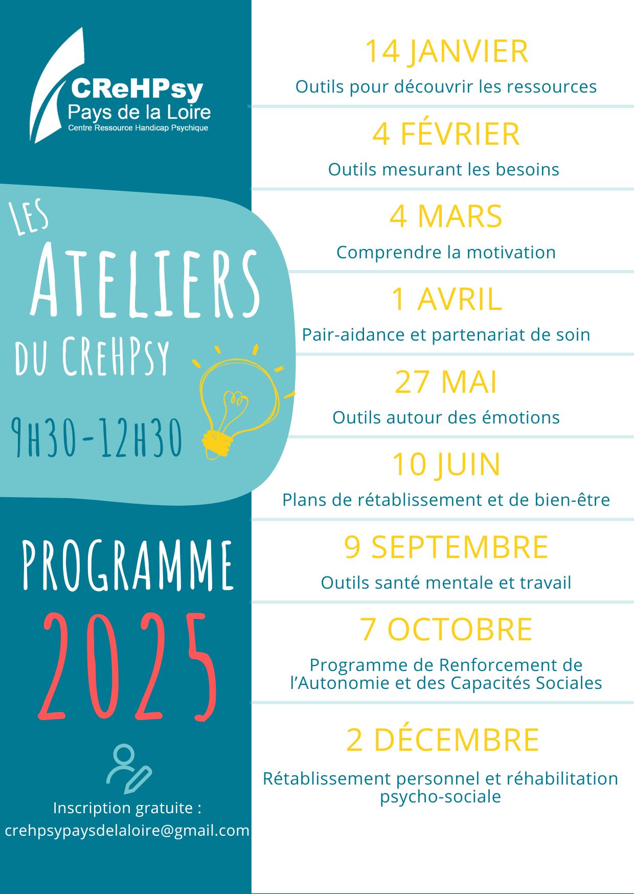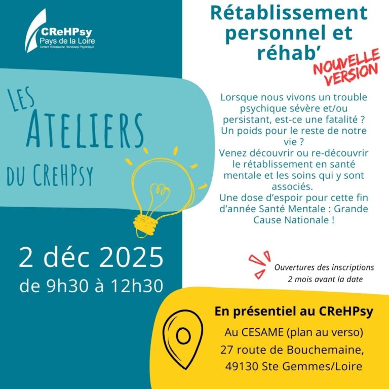 Ces séances sont gratuites et ouvertes à tous les publics sur inscription. Elles se font en présentiel dans les locaux du CReHPsy Pays de la Loire en groupe de 15 personnes.